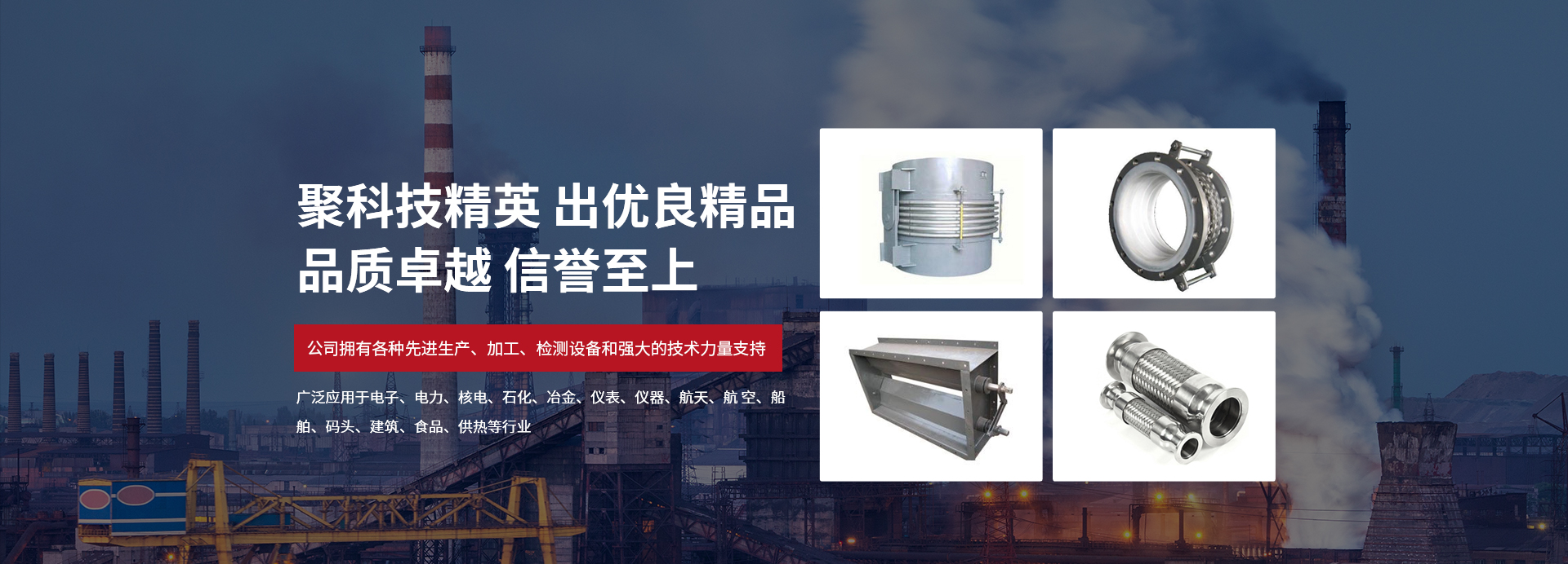 02 / 04  產(chǎn)品廣泛應(yīng)用,與多家企業(yè)合作產(chǎn)品廣泛應(yīng)用于電子、電力、核電、石化、冶金、儀表、儀器、航天、航 空、船舶、碼頭、建筑、食品、供執(zhí)管等行業(yè),先后為數(shù)百家大型企業(yè)提供各種型號的優(yōu)質(zhì)補償器。